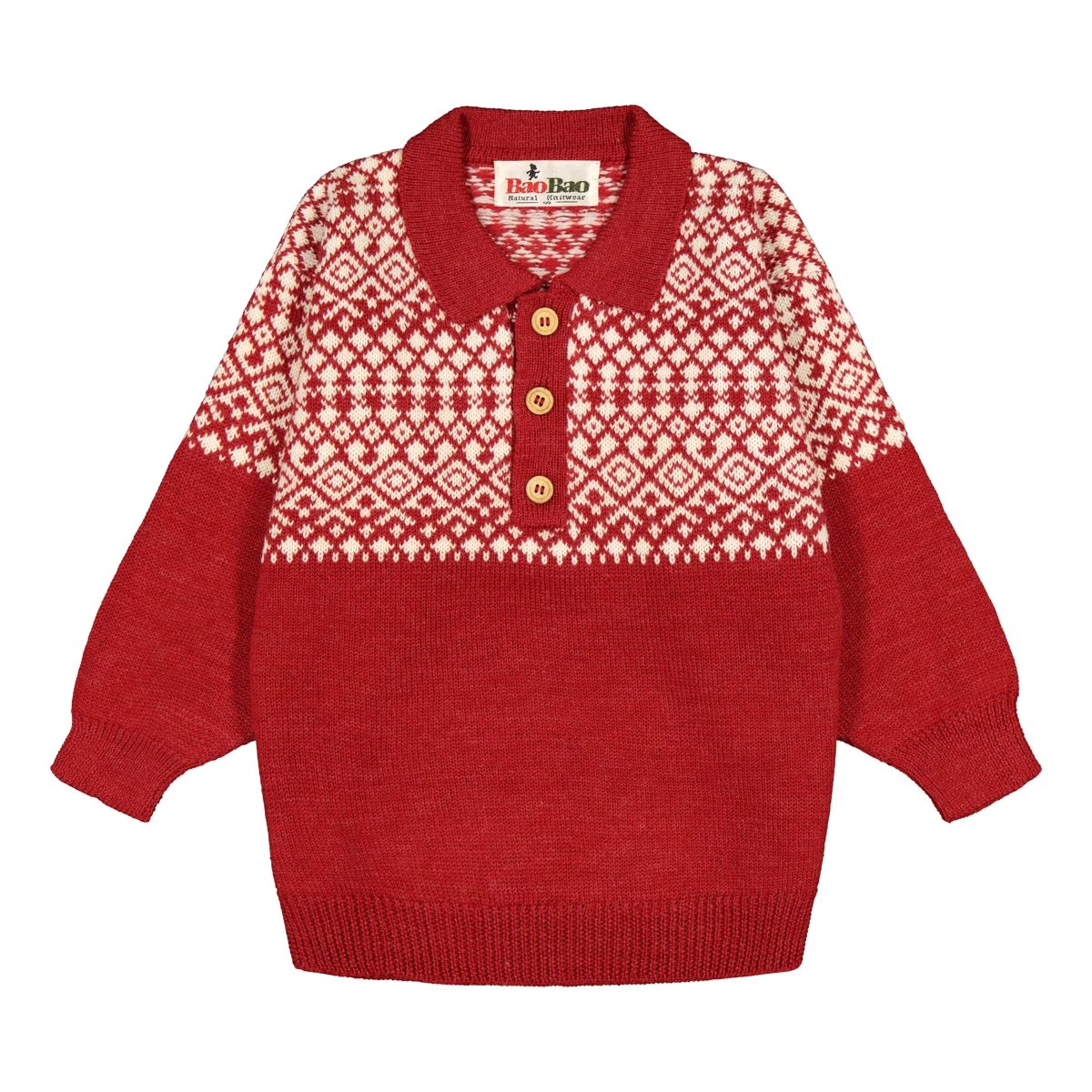 Lasten merinovillainen neulepaita, jossa kääntökaulus ja pääntiellä nappihalkio kolmella puisella napilla. Neulepaidan ylempi puolikas perinteikästä neuloskuviointia. Hihansuissa ja helmassa joustinneulosta. Materiaali 100% laadukasta merinovillaa. Neulepaita valmistettu Virossa.