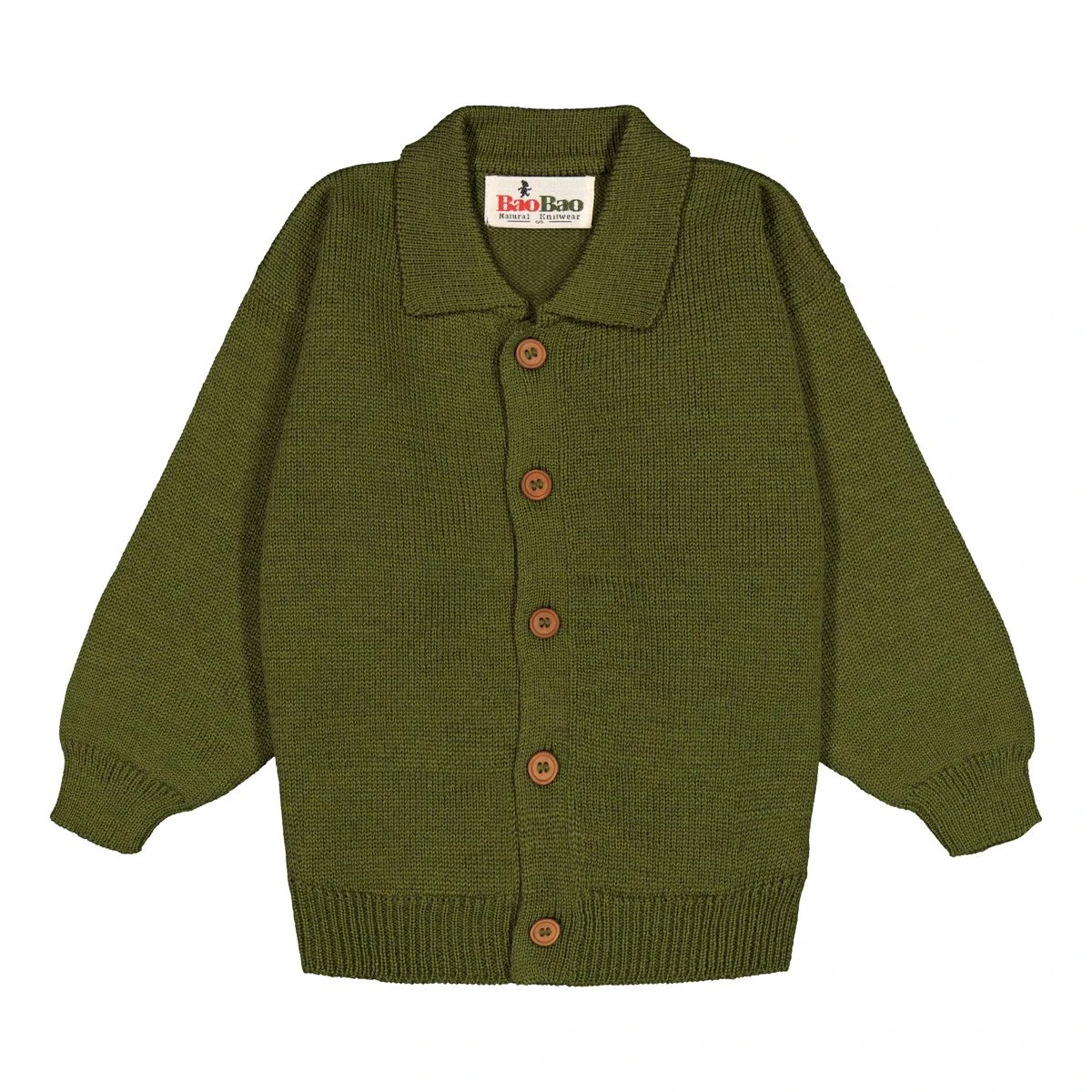 Lasten merinovillainen, yksivärinen neuletakki, jossa kääntökaulukset ja edessä napitus puisilla napeilla. Hihansuissa ja helmassa joustinneulosta.