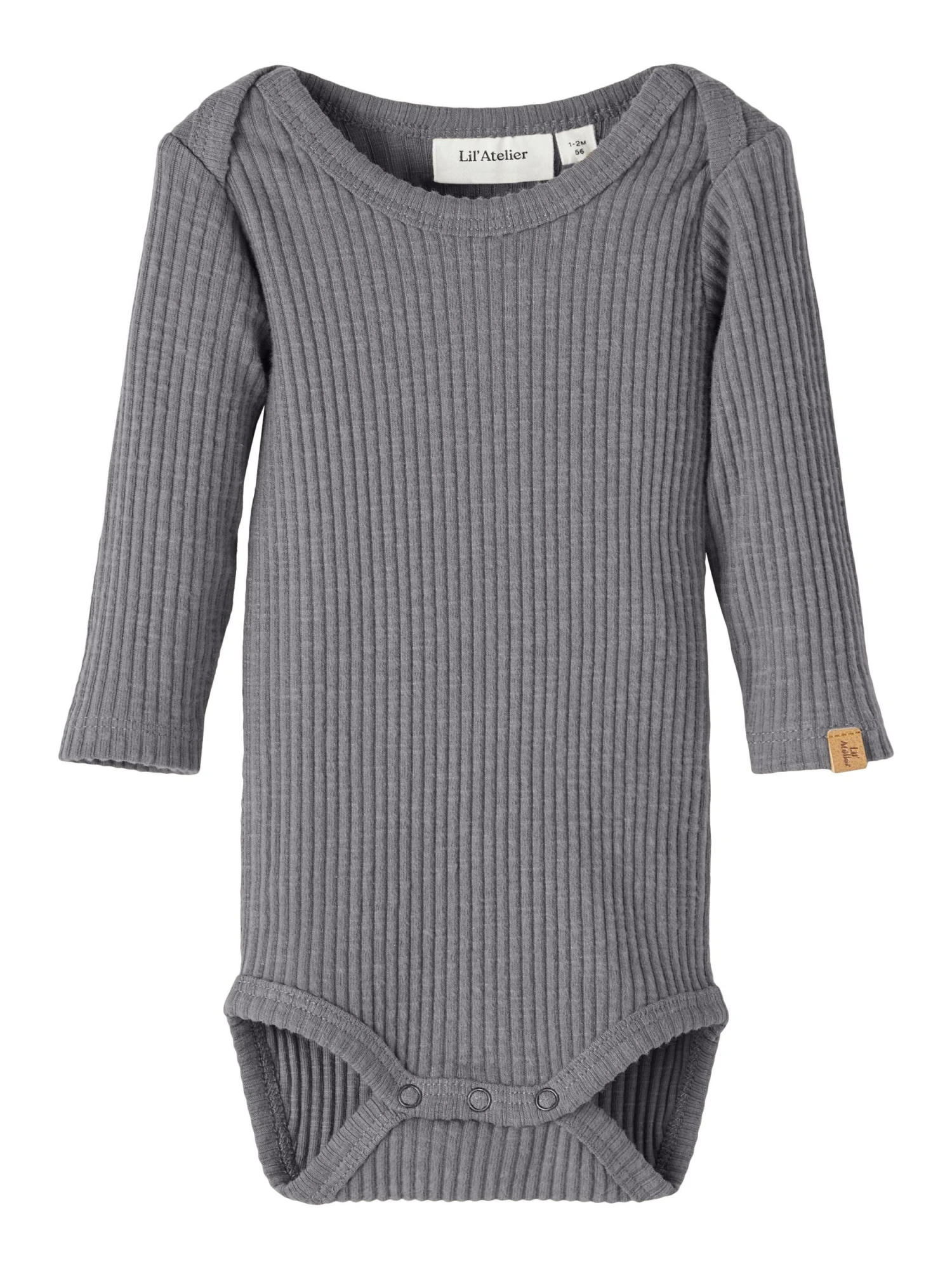 Lasten body, joka on tyyliltään ribbikangasta. Bodyssä napitus sekä pitkät hihat.