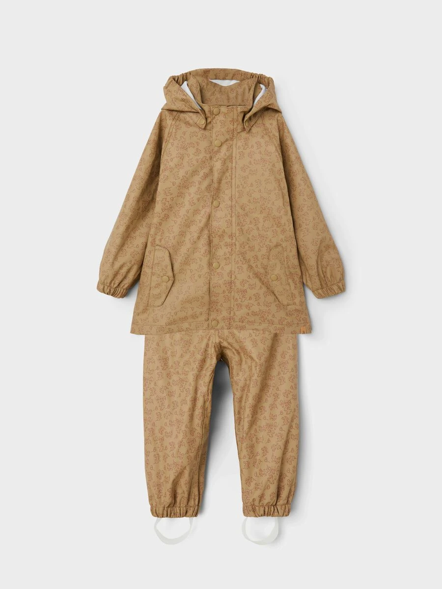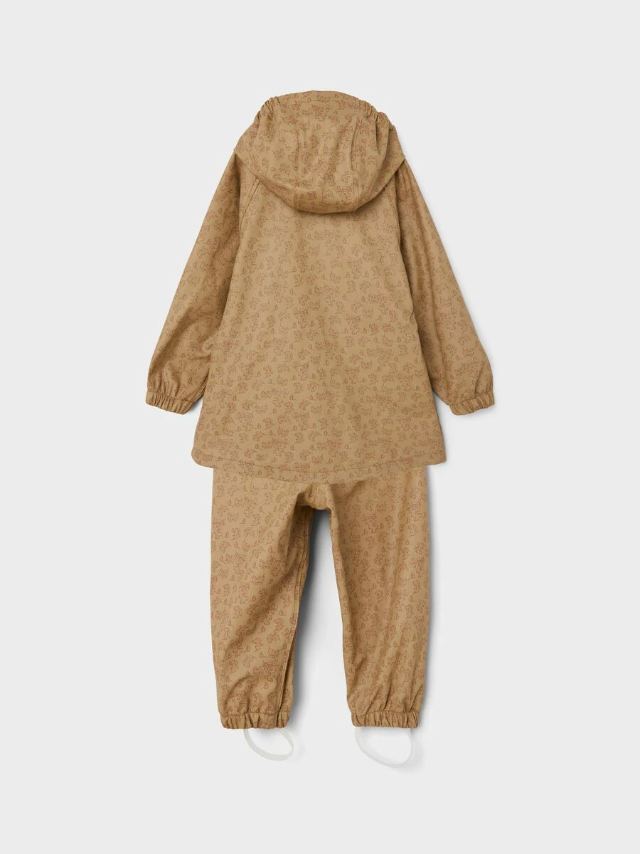 Lasten 2-osainen sadeasu vaahterakuosilla. Takissa on vetoketjukiinnitys, irrotettava huppu ja taskut painonapeilla. Raglanhihat tuovat mukavuutta liikkumiseen. Takin helma on muotoiltu takaa hieman pidemmäksi. Housuissa on napeilla säädettävä kuminauhavyötärö ja joustavat lahkeensuut.