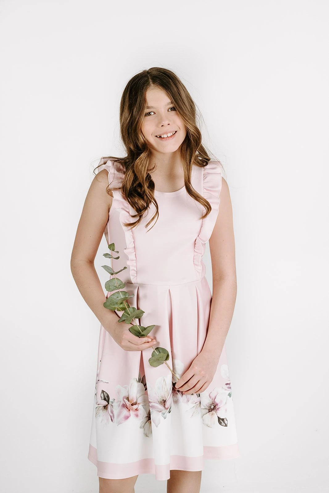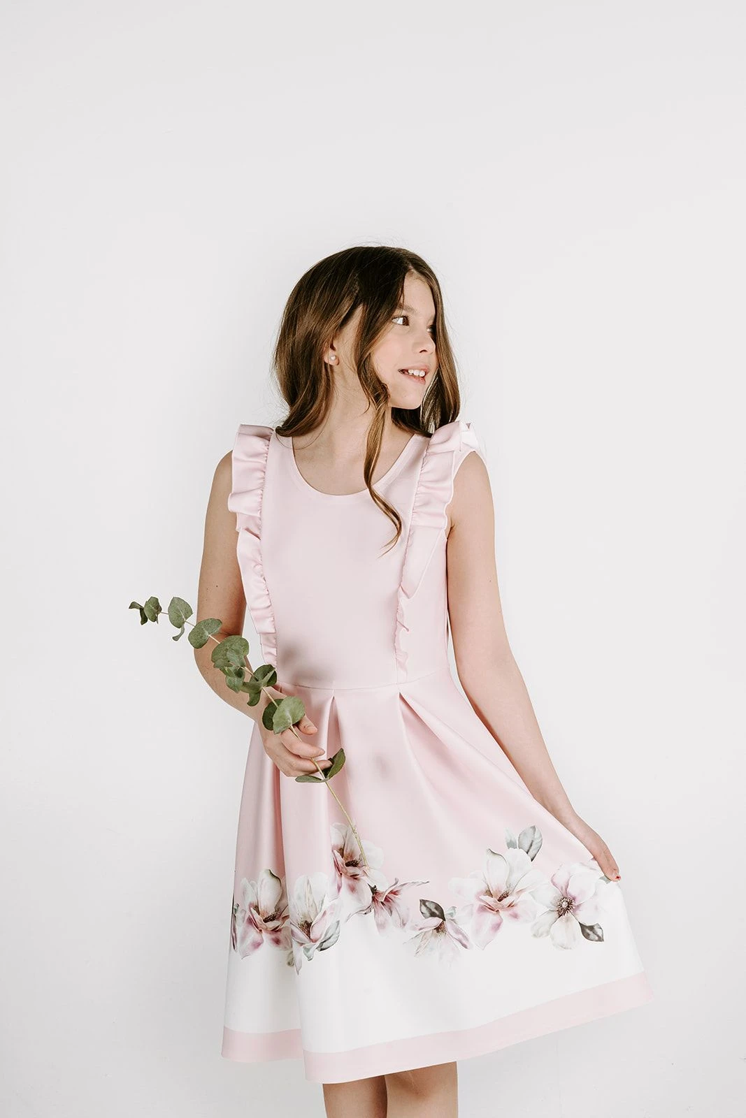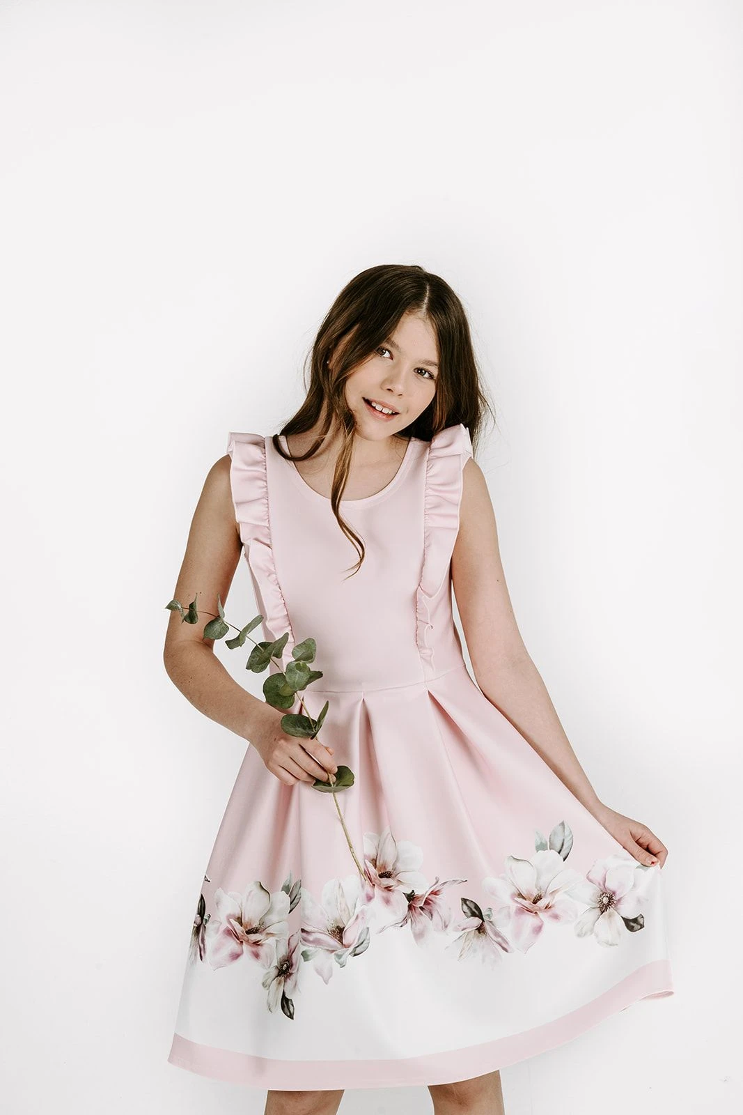 Ihana tyttöjen polvipituinen kesämekko. Mekon yläosassa edessä röyhelöiset yksityiskohdat. Helmassa magnoliakukkakuviota.