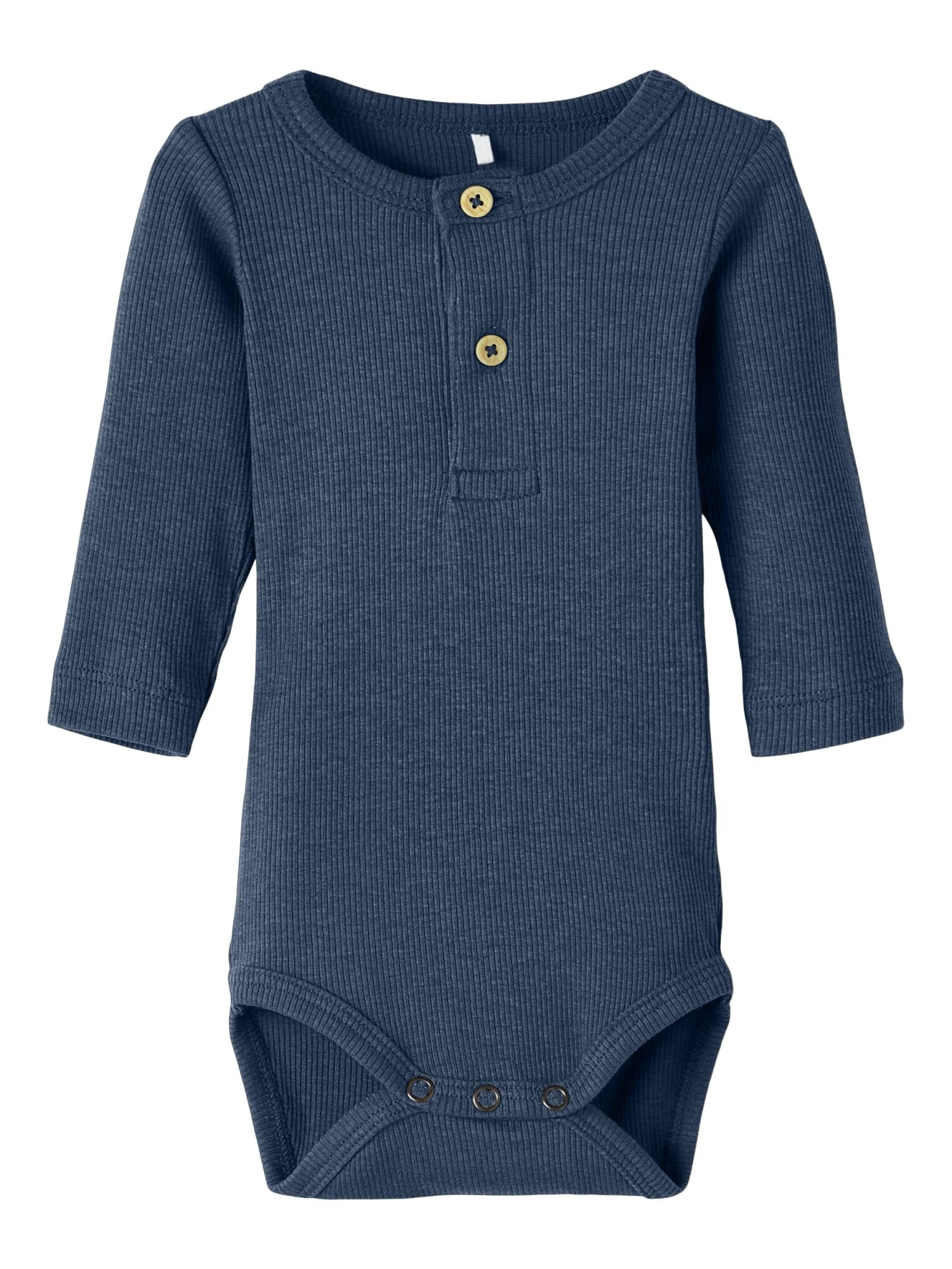 Lasten pitkähihainen body ribbineulosta. Kiinnitys neppareilla haarasta ja edessä pääntiellä nappihalkio.