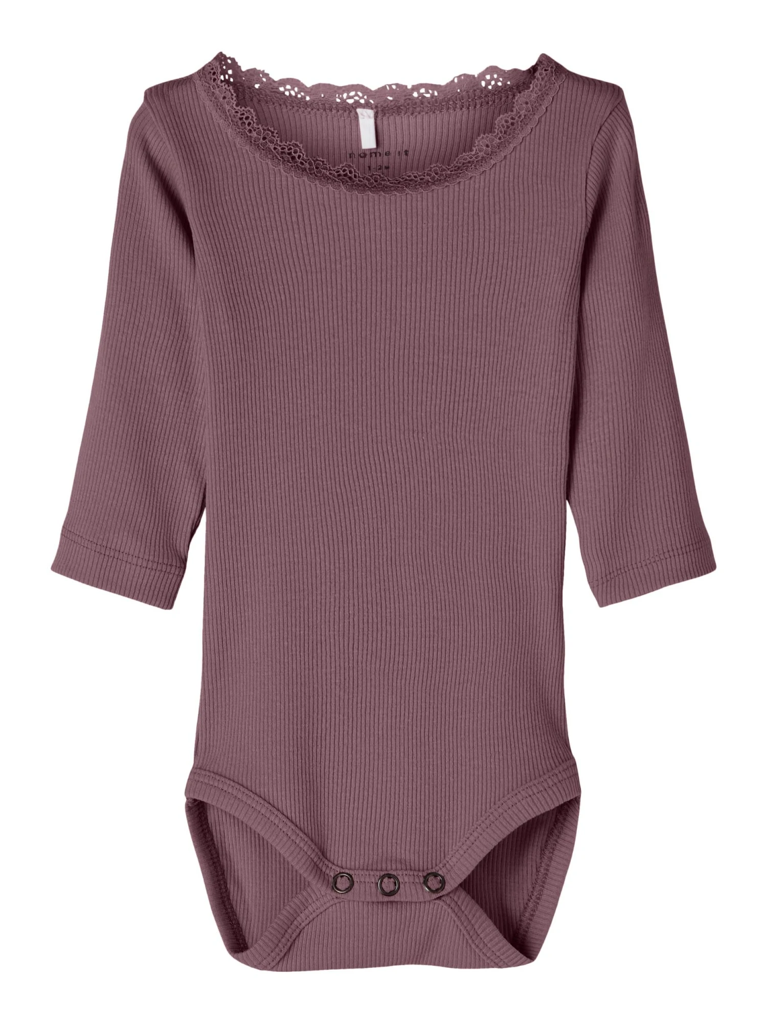 Name It lasten pitkähihaine ribbineulos body. Kiinnitys painonapeilla. Kauluksessa koristepitsiä. Tuotteen valmistuksessa on käytetty luomupuuvillaa.