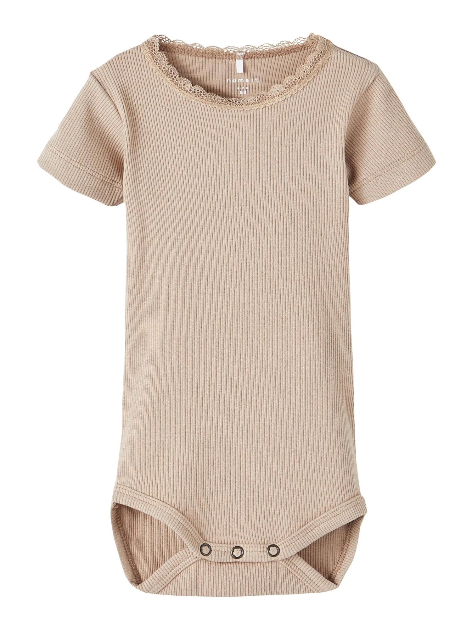 Name It lasten ribbineulos body. Kiinnitys painonapeilla. Kauluksessa koristepitsiä. Tuotteen valmistuksessa on käytetty luomupuuvillaa.