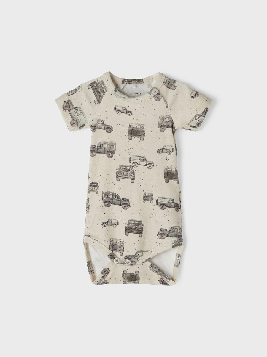 Lasten lyhythihainen body kivalla vanhat autot -printtikuviolla, haarassa nepparit.