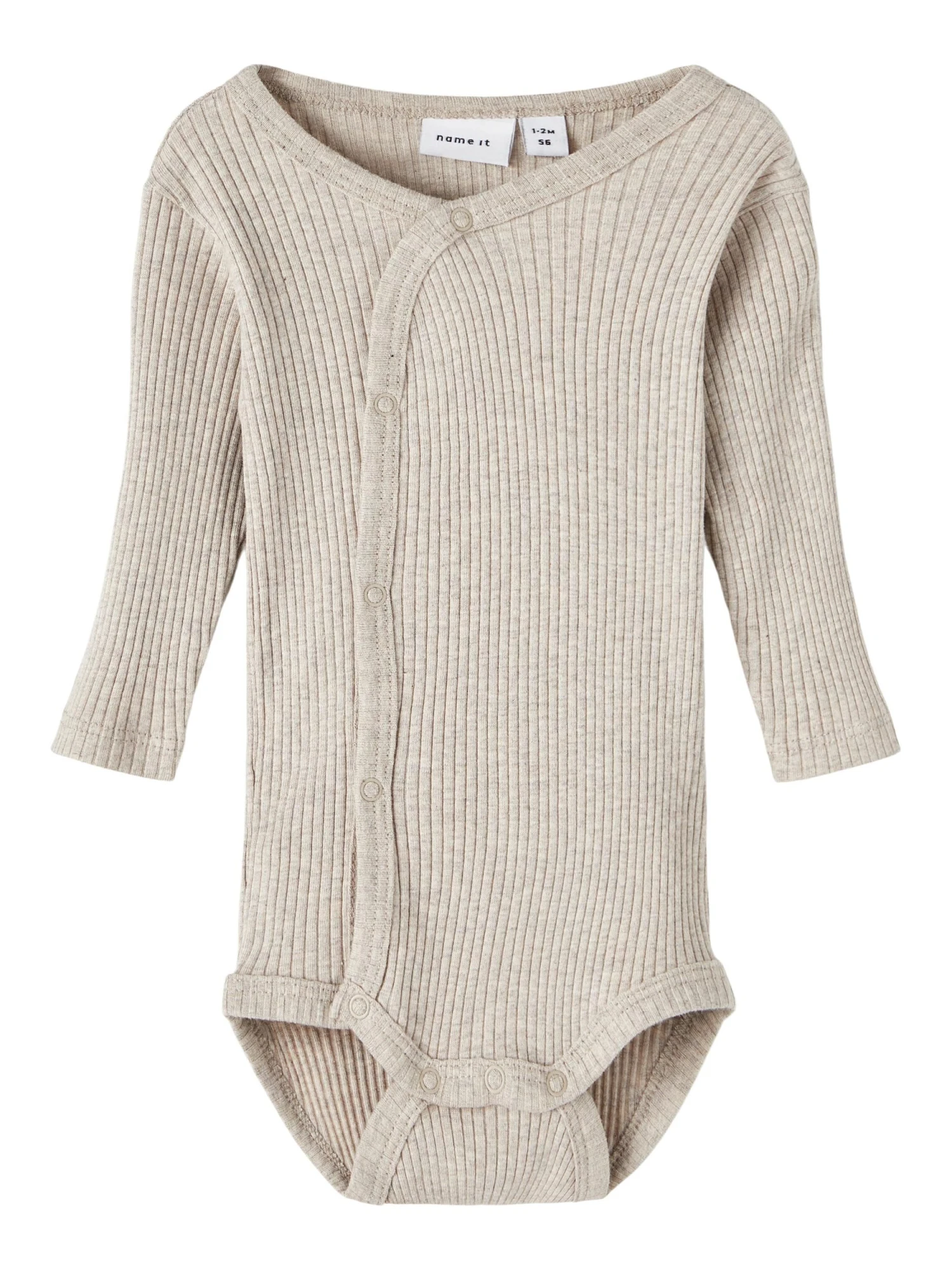 Lasten pitkähihainen ribbikangas tyylinen body. Bodyssa pyöreä pääntie. Painonapitus edessä.