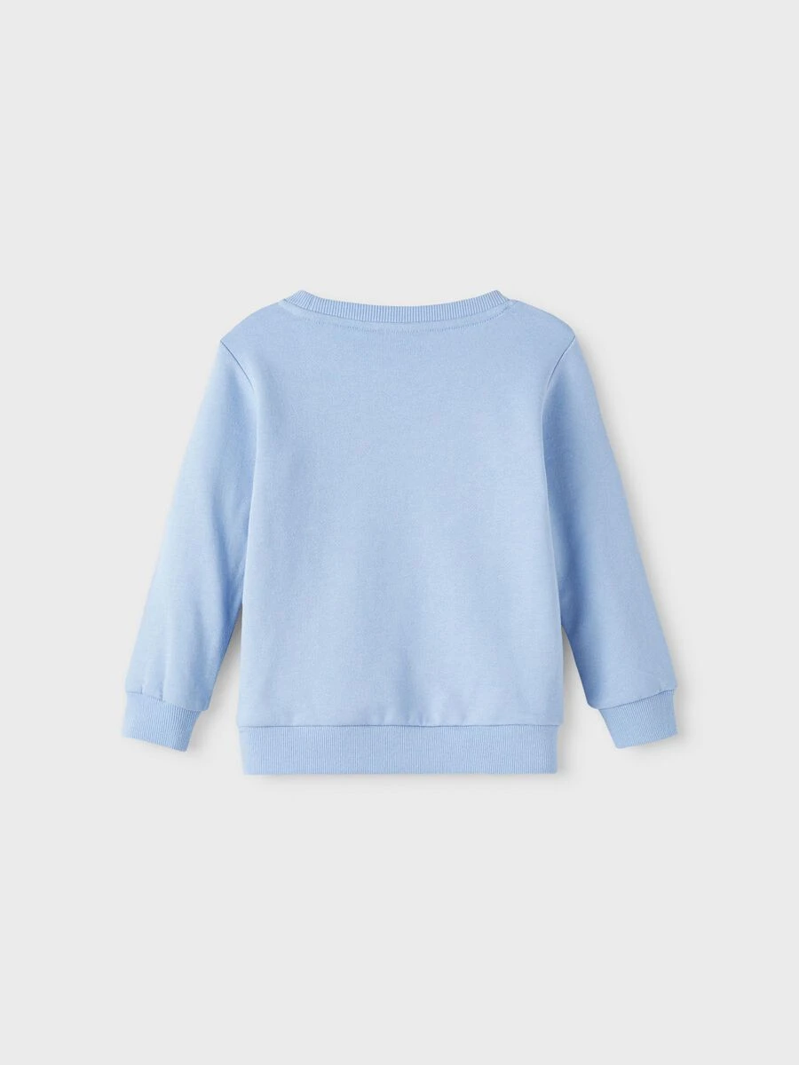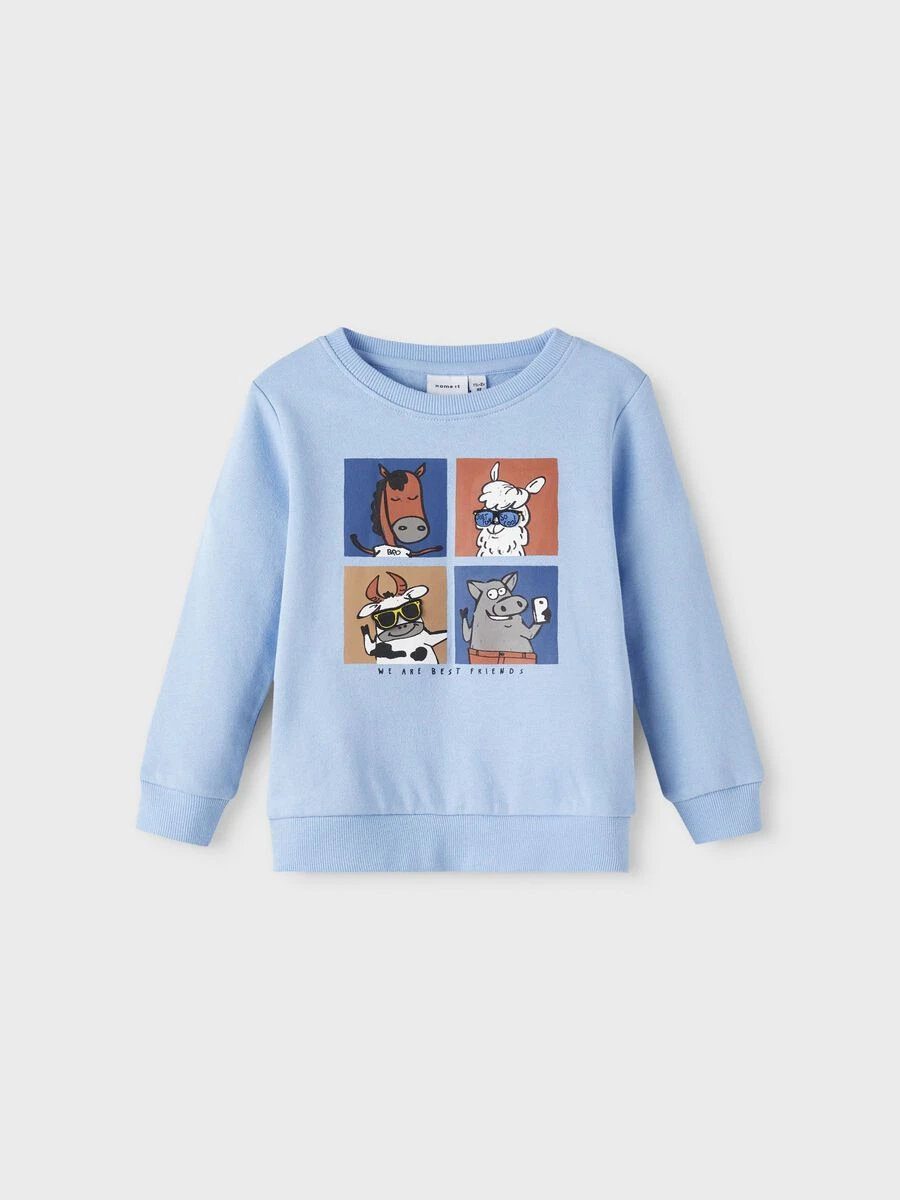 Lasten printti collegepusero, jossa pehmeä harjattu sisäpuoli. Puserossa on O-kaula-aukko ja hihoissa ja helmassa resorit.