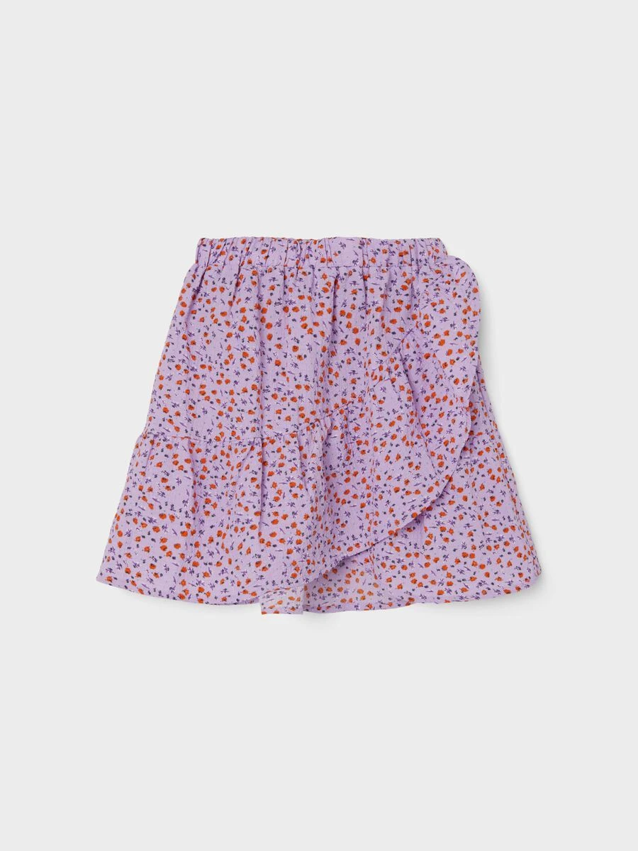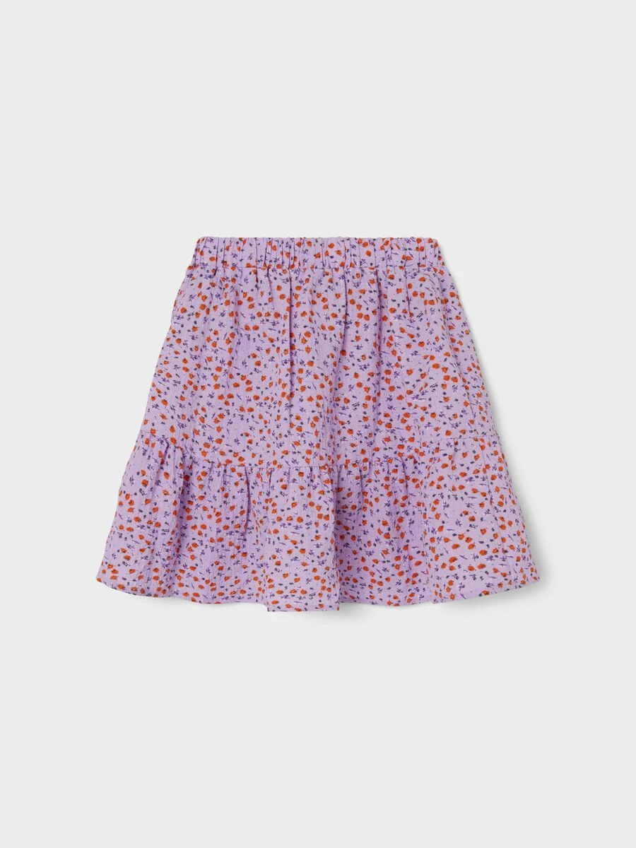 Lasten pikkukukallinen, polvimittainen röyhelöhame. Joustava, säädettävä vyötärö.