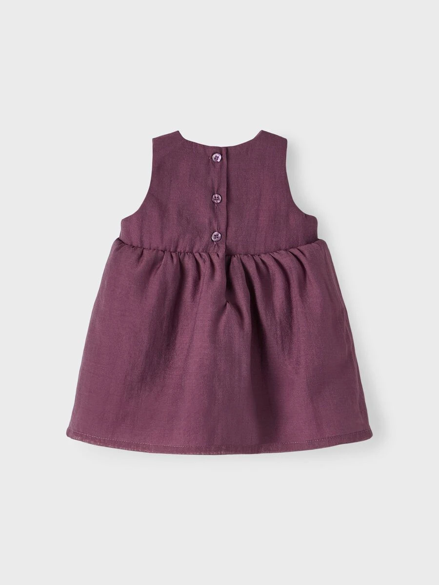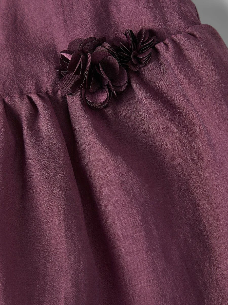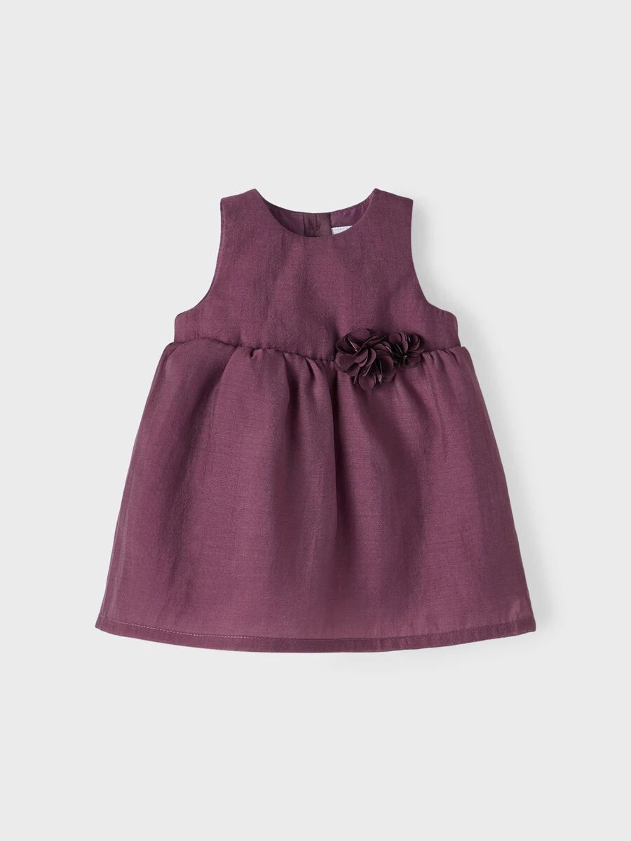 Name it kaunis luumunvärinen juhlamekko. Edessä vyötäröllä kukkasomiste.