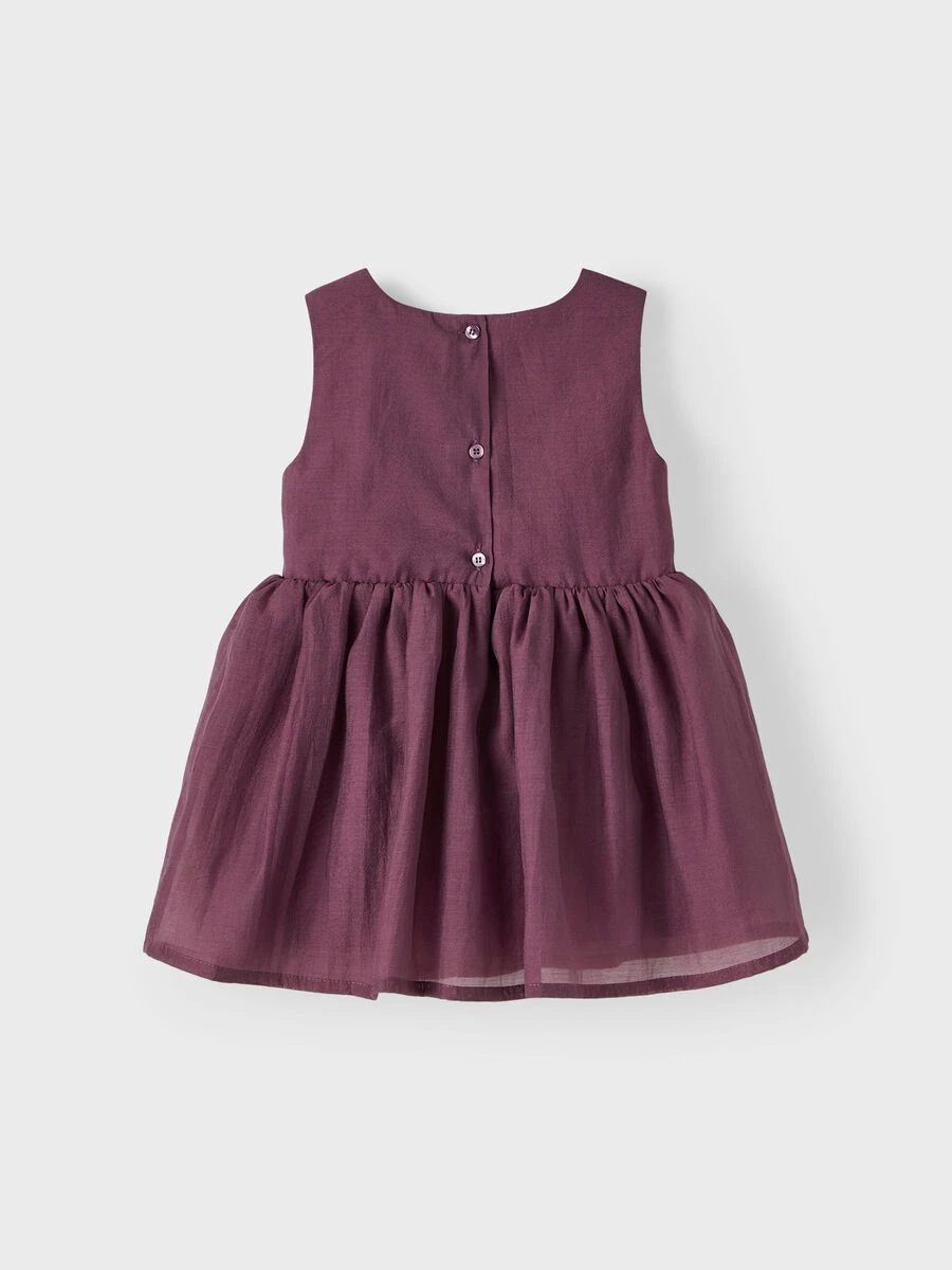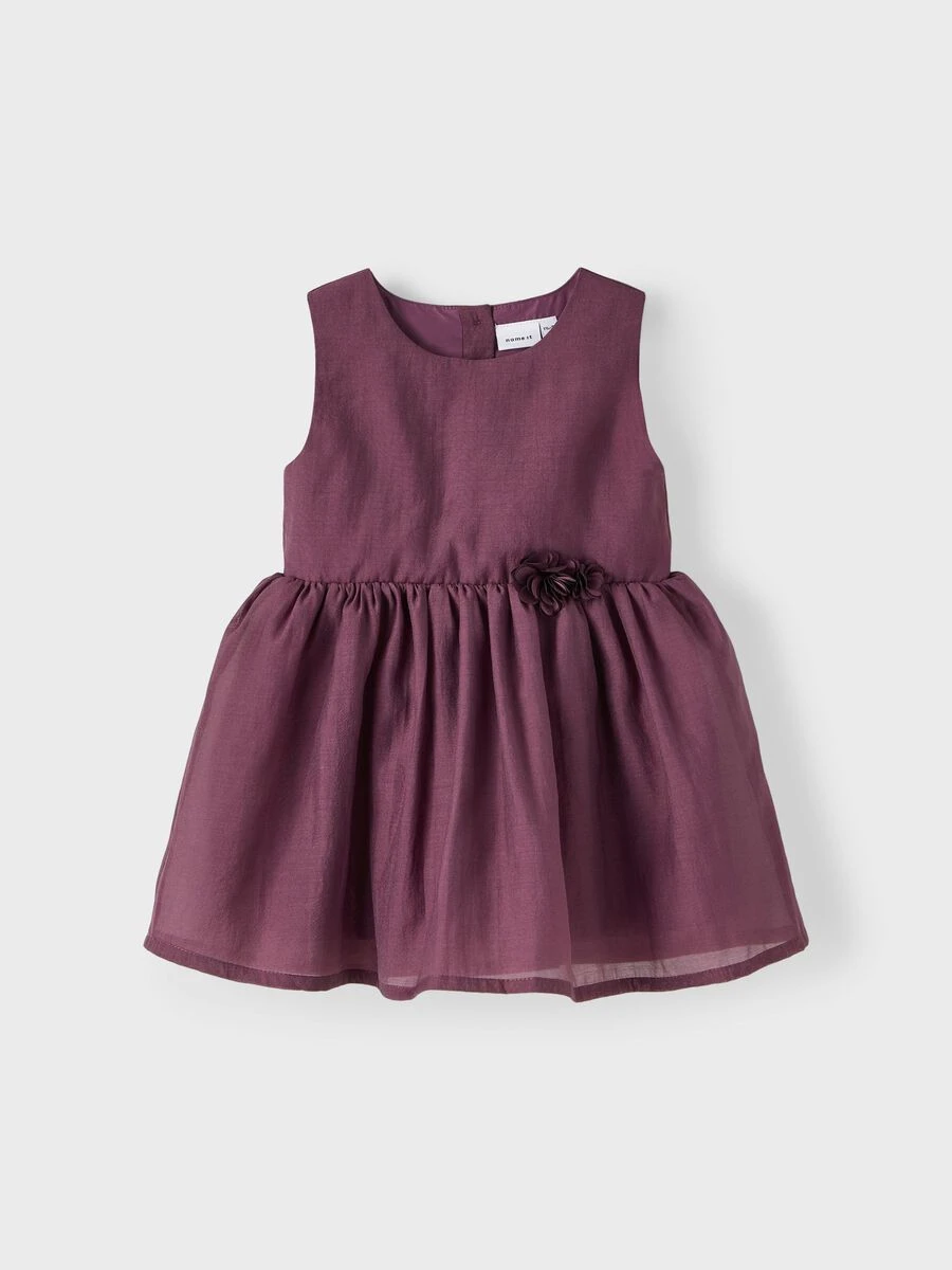 Name it kaunis luumunvärinen juhlamekko. Edessä vyötäröllä kukkasomiste.
