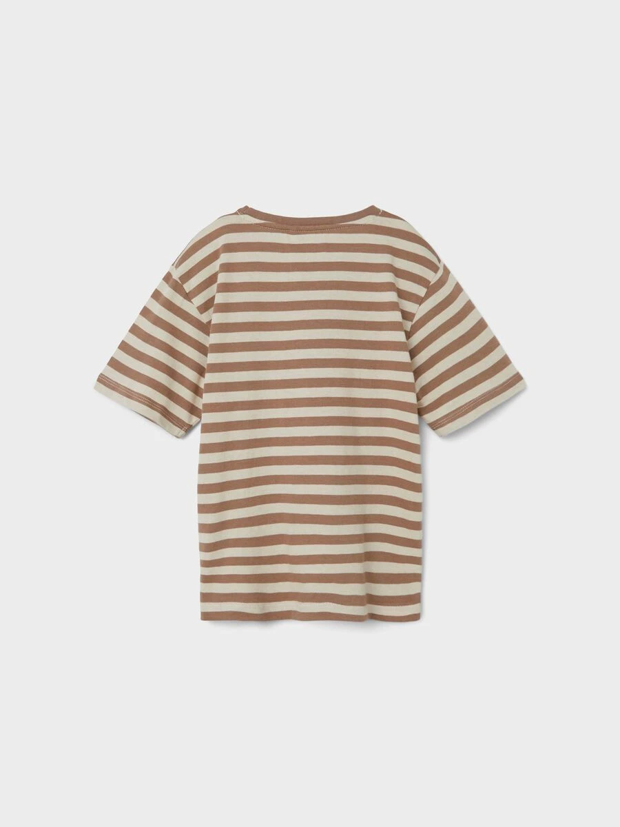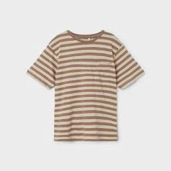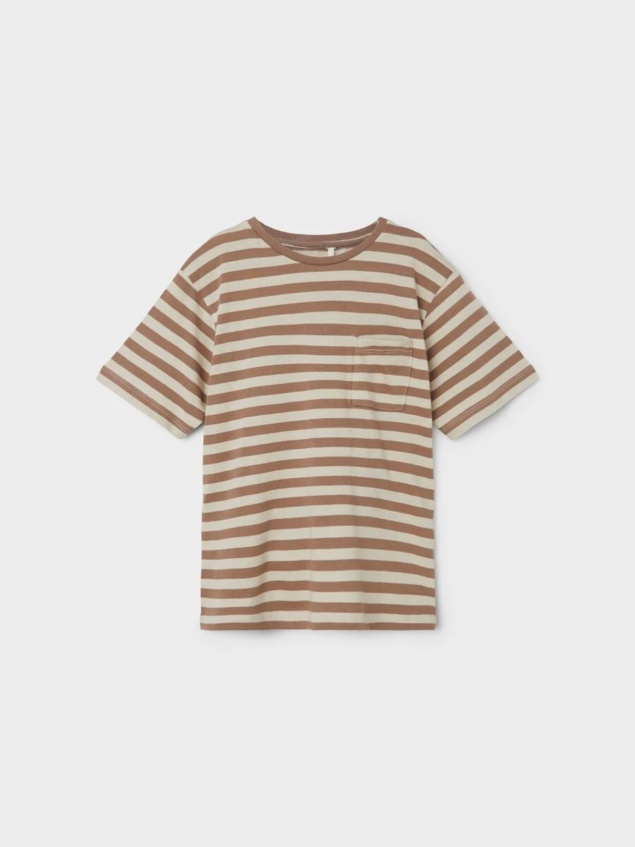 Lasten trikoo lyhythihainen t-paita raitakuviolla. Paidan edessä pieni tasku yksityiskohtana. Paita on malliltaan loose fit. Tuotteen materiaalina käytetty luomupuuvilla on kasvatettu ilman haitta kemikaaleja.
