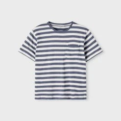 Lasten trikoo lyhythihainen t-paita raitakuviolla. Paidan edessä pieni tasku yksityiskohtana. Paita on malliltaan loose fit. Tuotteen materiaalina käytetty luomupuuvilla on kasvatettu ilman haitta kemikaaleja.