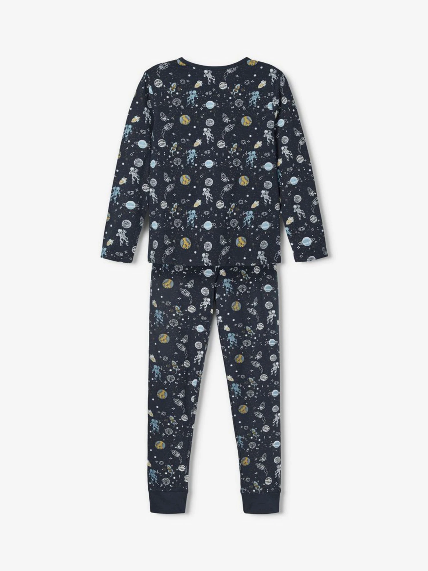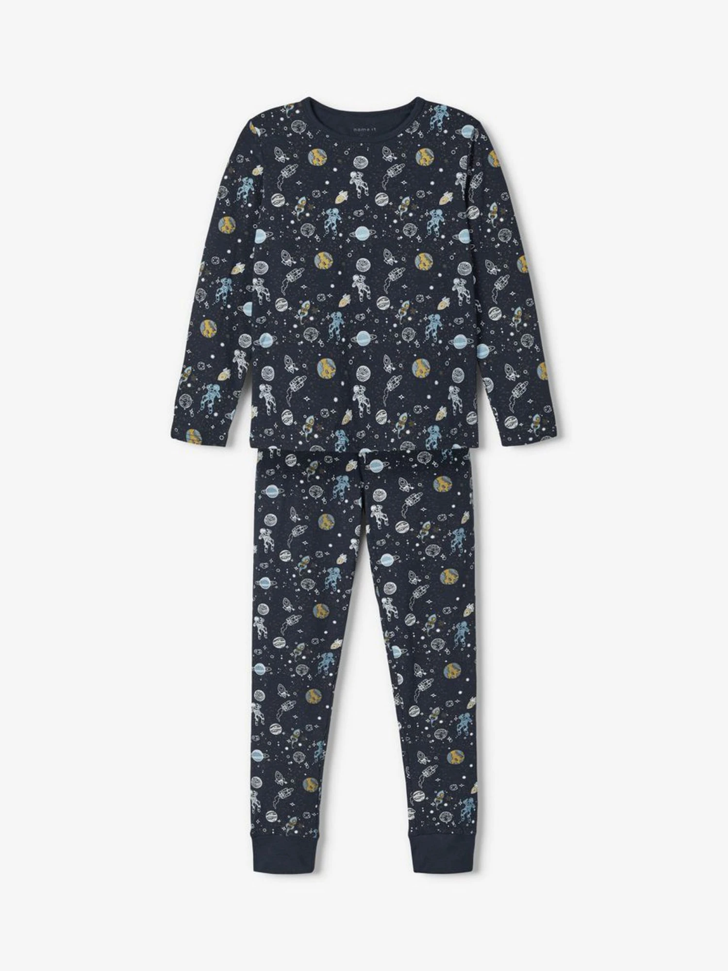 Name It lasten kuviollinen pyjama, joka on valmistettu luomupuuvillasekoitteesta. Pehmeä ja joustava materiaali, joka tuntuu päällä mukavalta. Setissä on pitkähihainen t-paita ja pitkät housut.