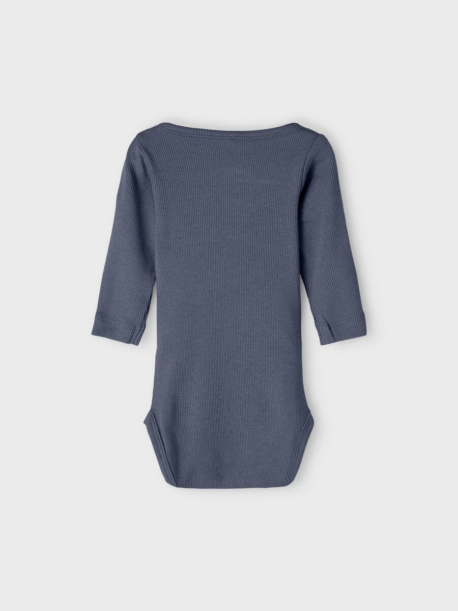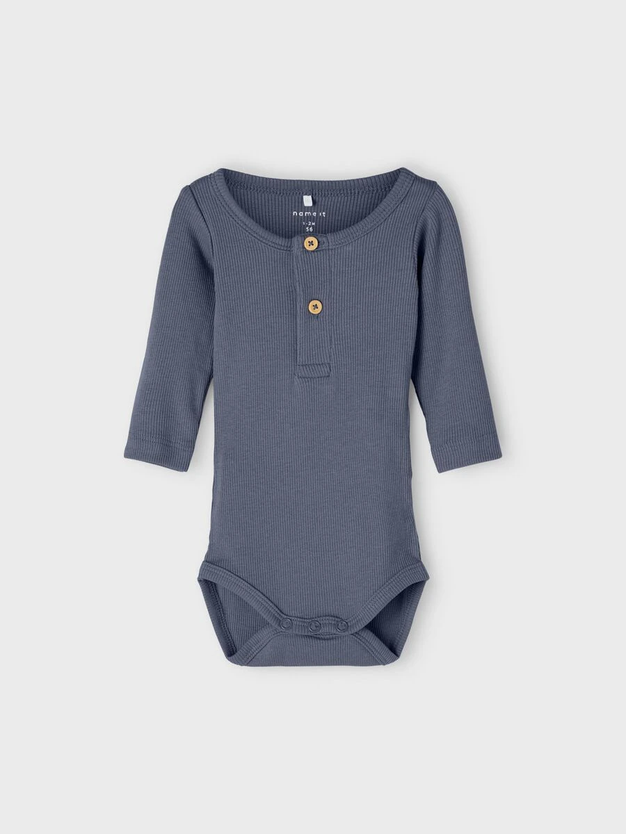 Lasten pitkähihainen body ribbineulosta. Kiinnitys neppareilla haarasta ja edessä pääntiellä nappihalkio.