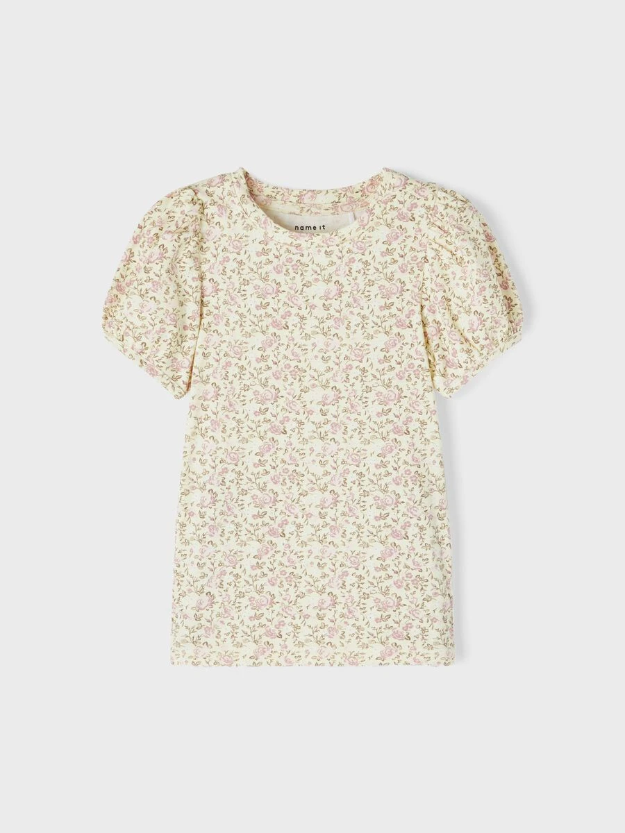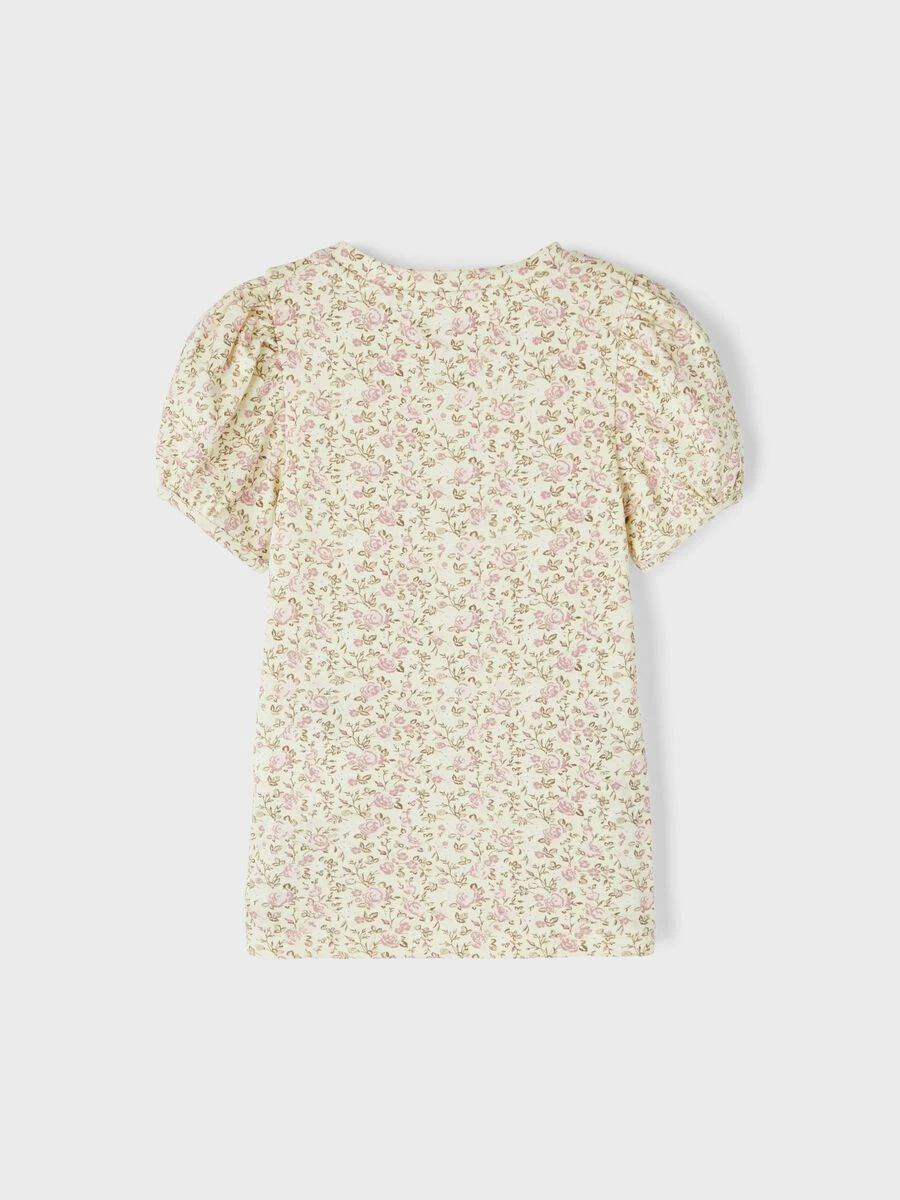Lasten ribbineuloksinen, kukkakuviollinen toppi, lyhyet puhvihihat. Joustavat hihansuut. O-pääntie.