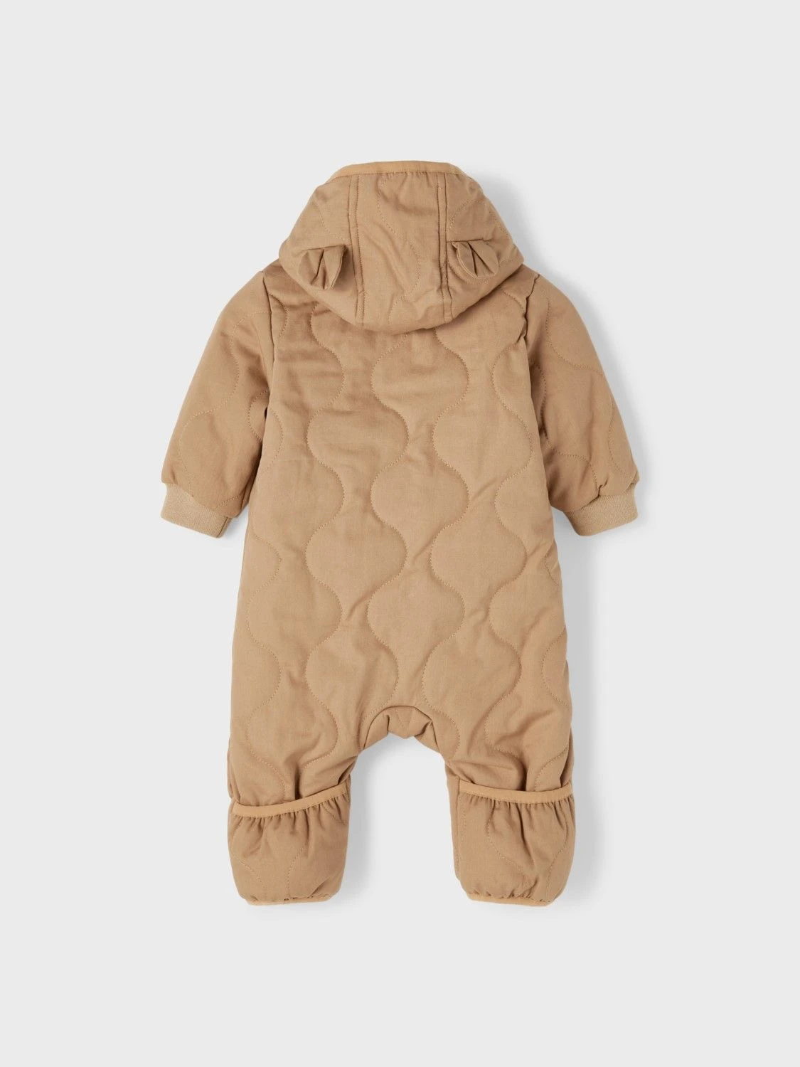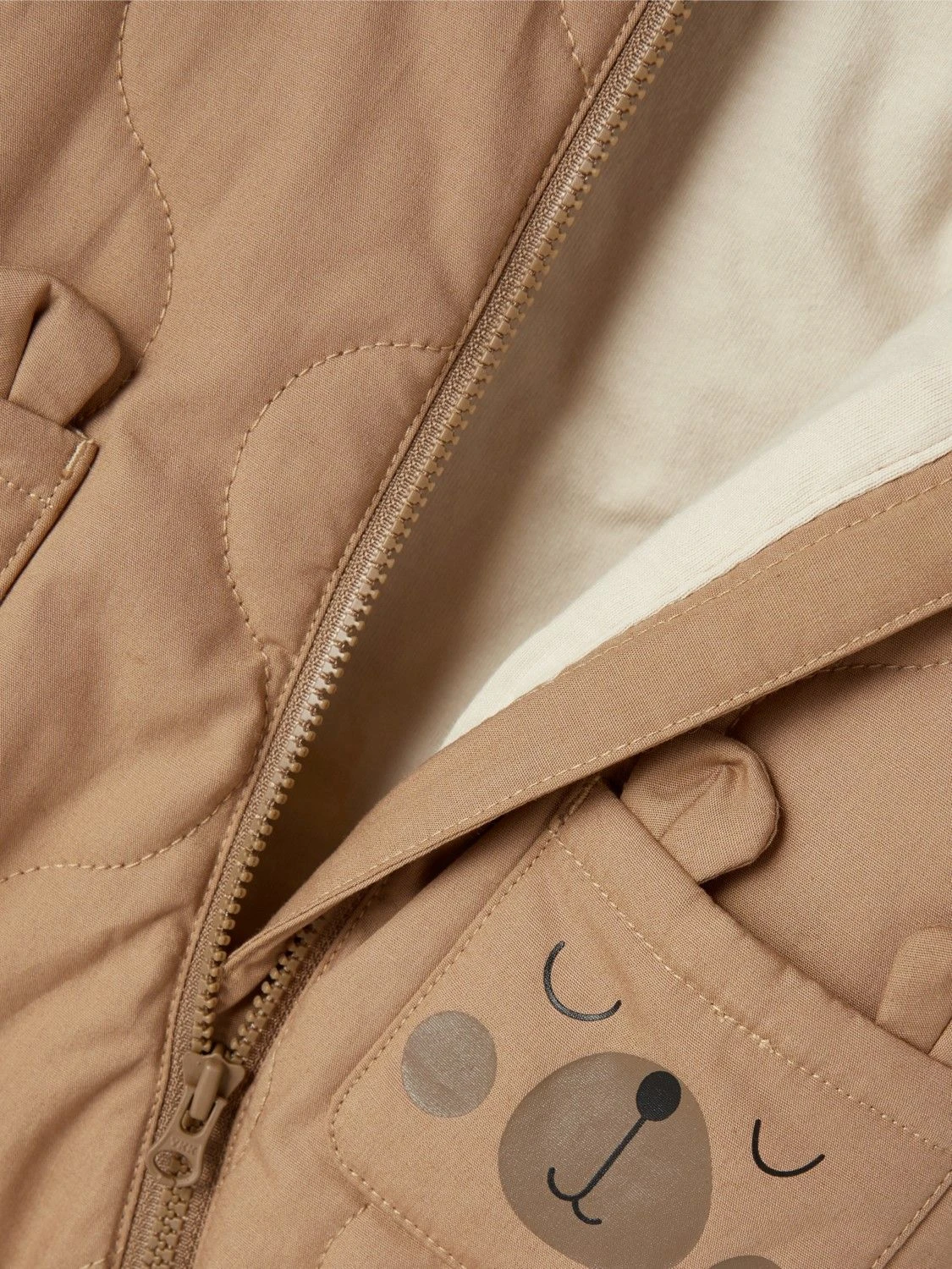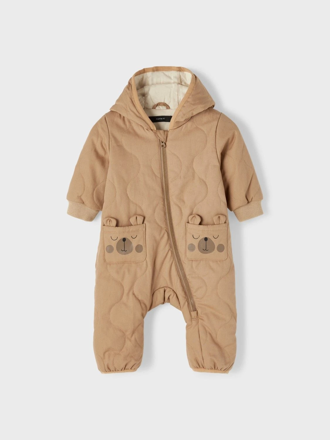 Lasten pehmeä ja suojaava tikkihaalari. Puuvillatrikoovuori. Huppu, jossa nallekorvat. Hihansuissa resorit. Lahkeensuut, jotka voi kääntää suojaamaan jalkateriä. Vetoketju ja vetoketjusuoja, joka estää vetoketjua tarttumasta ihoon. Ihanat nalletaskut.