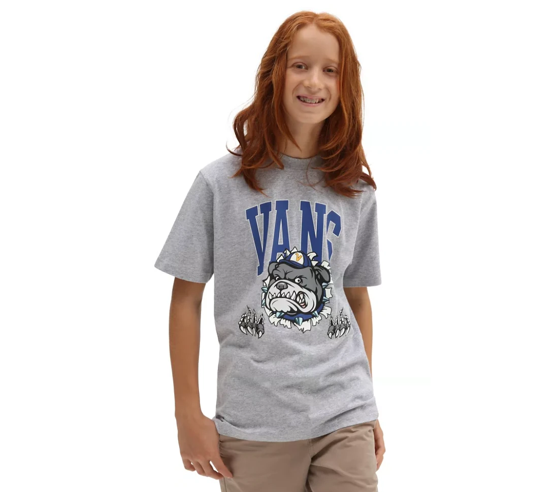 Vans Boys Varsity Bulldog T-paidassa on pyöreä pääntie, lyhyet hihat ja Vans-logo bulldog-grafiikalla edessä.
